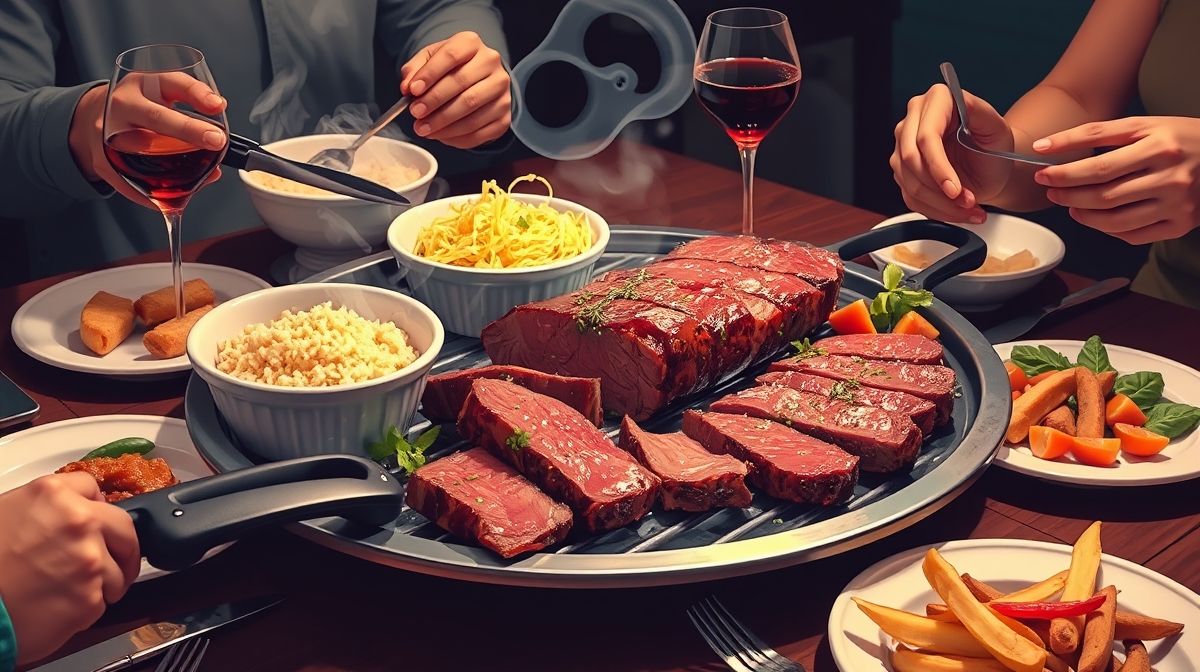 Imagem ilustrativa mostrando uma mesa de churrasco com várias porções de lombo suculento servido com acompanhamentos como farofa e salada, ambiente festivo e convidativo, fotografia gastronômica [ads2]