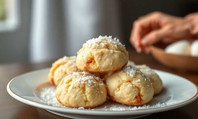 Em cerca de 30 minutos, você tem biscoitinho de coco assado a 180 °C, com aroma marcante e textura levemente crocante por fora.