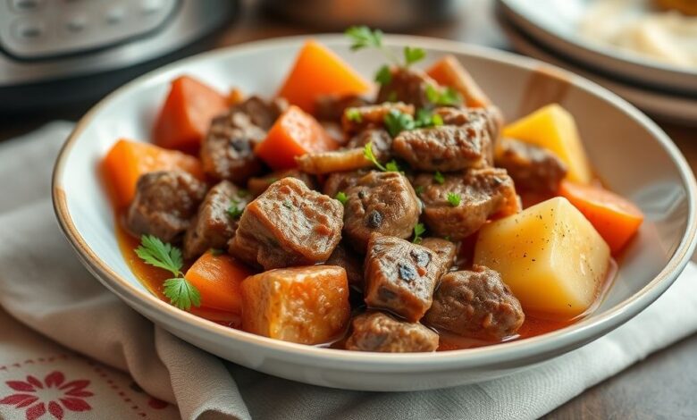 Carne ensopada na panela de pressão servida com caldo encorpado e legumes frescos, prato caseiro e reconfortante.