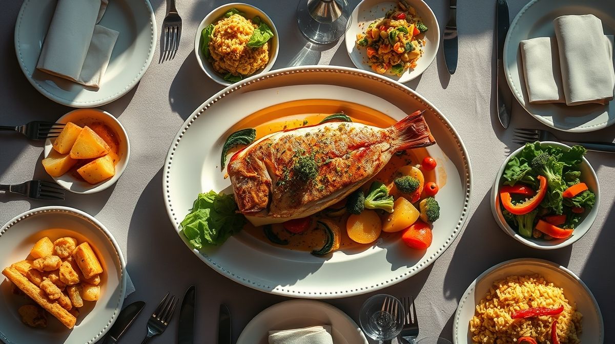 Pratos saborosos com peixes e frutos do mar.