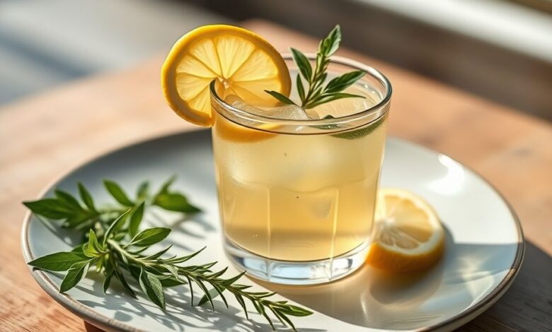 Xícara de chá detox pronto com limão e ervas frescas, destacando a receita energizante e saudável