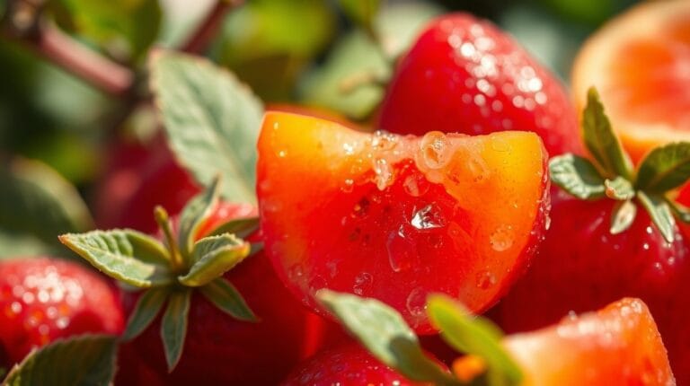 - Frutas em tons amarelos e laranjas: manga, abacaxi, carambola, mexerica, pêssego e melão.