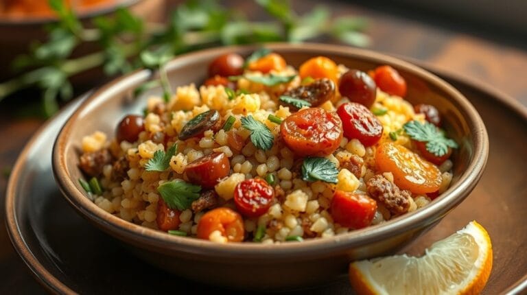 O couscous marroquino com legumes caramelizados e especiarias é uma opção saborosa e versátil para quem busca um prato principal sem carne, mas que também funciona muito bem como acompanhamento para grelhados de frango, peixe ou carne vermelha. Rico em texturas e aromas, esse prato conquista pelo equilíbrio entre o couscous macio, os legumes levemente adocicados e o toque especial das especiarias.