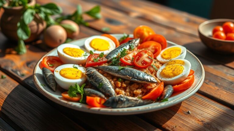 Unte uma assadeira com azeite e prepare a decoração: coloque os ovos cozidos, os tomates fatiados e algumas sardinhas por cima. Despeje a massa na forma, pressione levemente para nivelar e deixe esfriar. Depois, desenforme com cuidado para não quebrar.