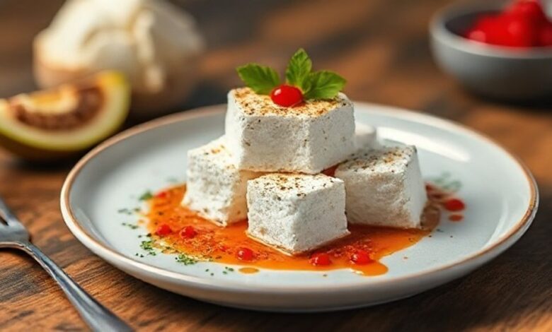 Os cubos de maria-mole podem ser incorporados em pavês, mousses ou servidos sobre saladas de frutas, adicionando textura e charme retrô. Outra ideia é usar os pedaços como cobertura de bolos simples, como pão de ló, criando uma sobremesa inovadora.
