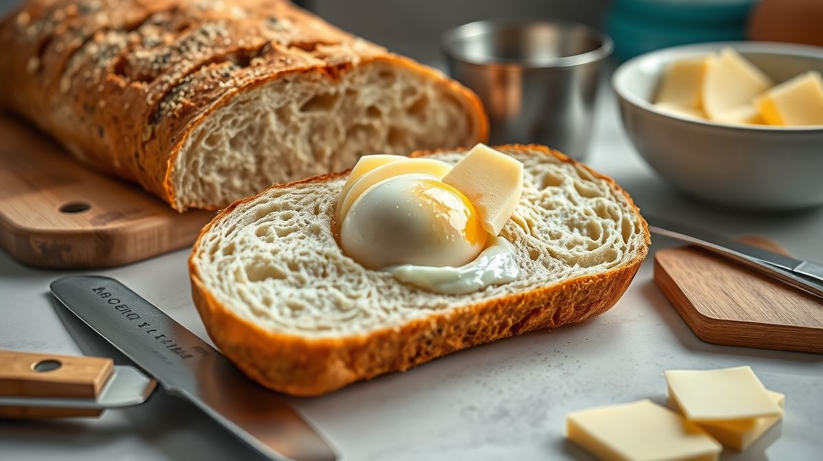 passo a passo de pão cortado ao meio recheado com ovo cru e fatias de queijo mussarela, utensílios de cozinha ao redor, superfície limpa, estilo fotográfico realista e iluminado [ads2]