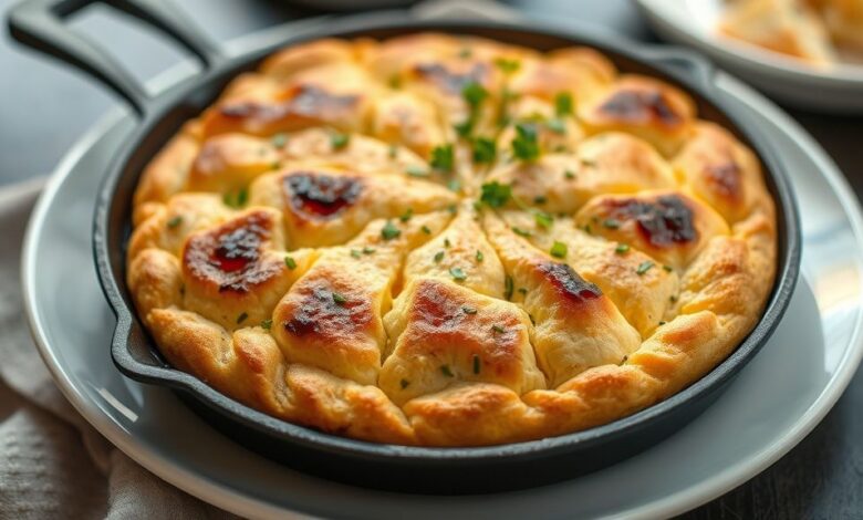 Pão de frigideira macio e dourado pronto para servir, mostrando textura caseira e sabor caseiro