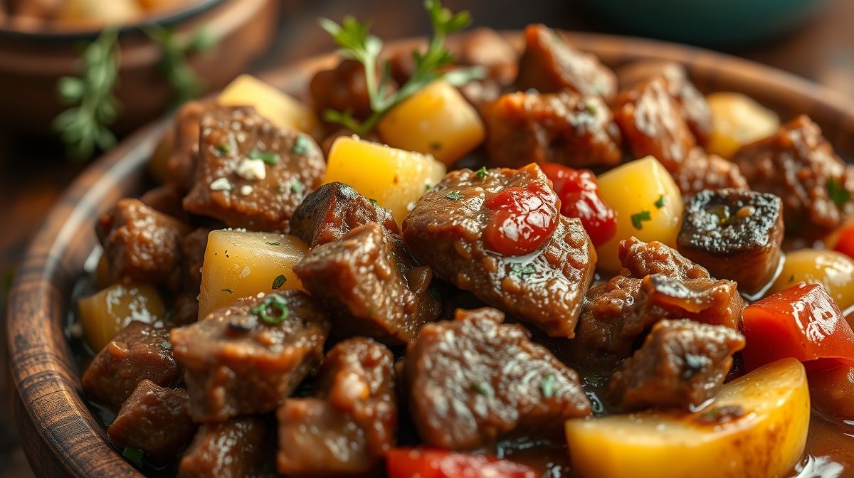 kcalAprenda a preparar um picadinho de carne macio, com batatas e cenouras, perfeito para uma refeição nutritiva e prática no dia a dia.