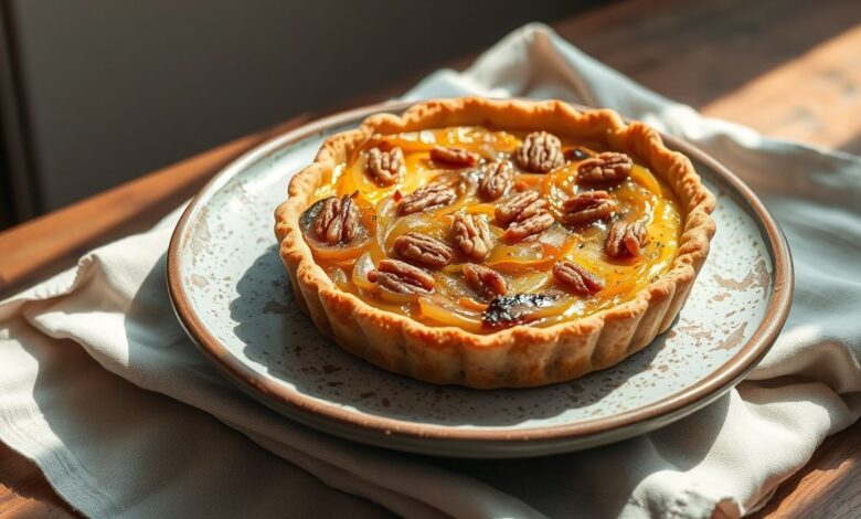 Quiche sem glúten de cebola caramelizada e nozes: sabor e crocância para todos