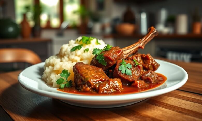 kcalReceita de rabada com mandioca cremosa, temperada com alho, cebola e pimentões, perfeita para refeições reconfortantes.