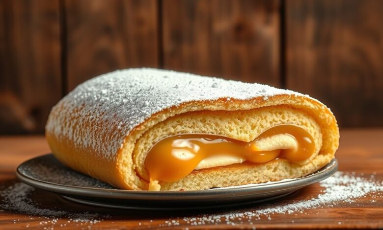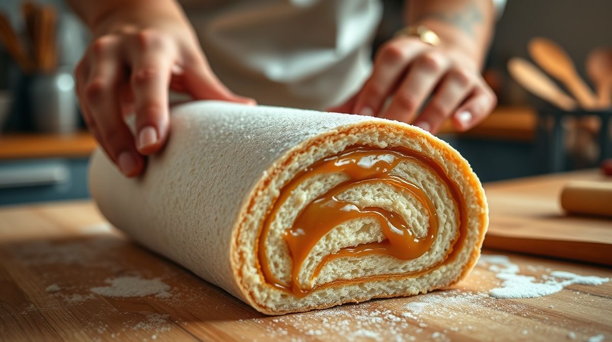 - Passo 8: Desenrole a massa fria, espalhe o doce de leite, enrole novamente e finalize com açúcar de confeiteiro.