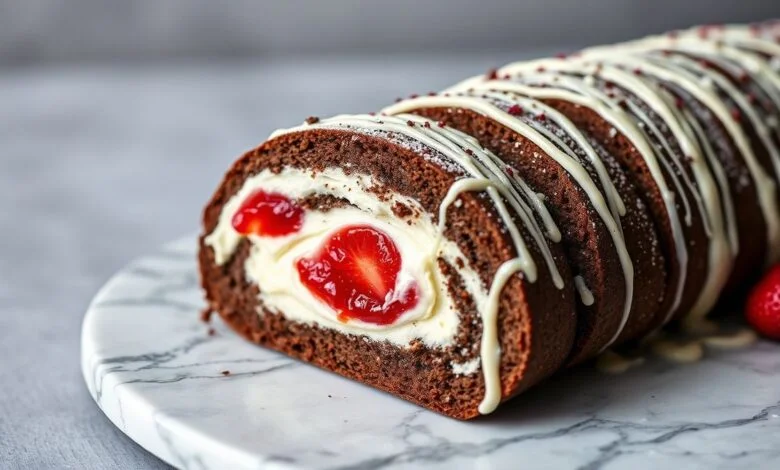 Este rocambole une uma massa modelável de chocolate com recheio cremoso e geleia, tudo feito sem precisar ligar o forno.