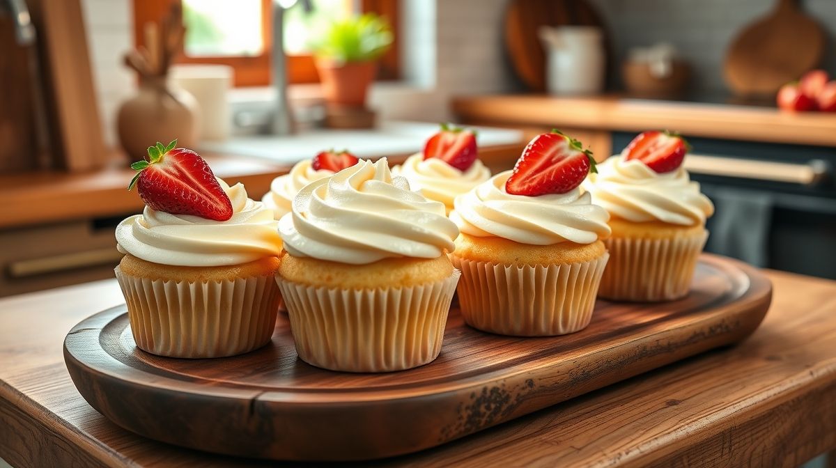 Shortcake Vanilla Cupcakes em uma bandeja rústica, com frosting suave e brilhante de mascarpone, decorados com morangos frescos, ambiente de cozinha aconchegante com luz natural