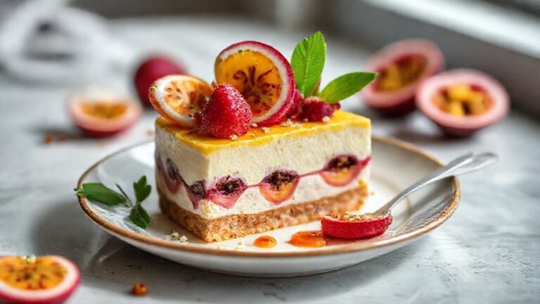 O maracujá, além de perfumar e aromatizar a sobremesa, contribui com propriedades calmantes e vitaminas antioxidantes. Sua acidez natural equilibra os açúcares e realça o sabor de cremes lácteos, tornando a sobremesa menos enjoativa e mais elegante ao paladar. Em versões com polpa natural, ainda fornece textura sutil e visual atrativo pelas sementinhas pretas.
