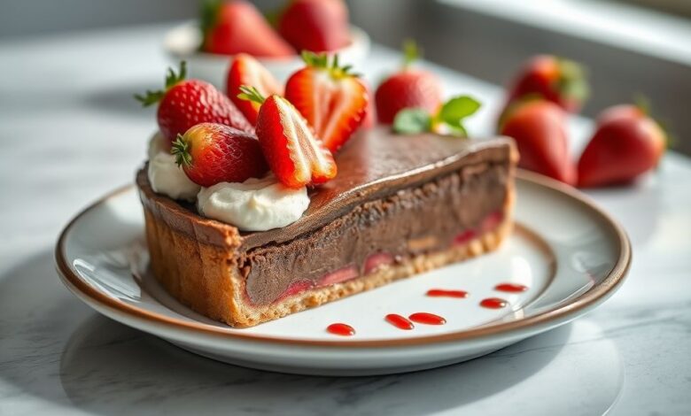 A torta de chocolate com morango é uma sobremesa elegante e deliciosa, perfeita para impressionar em ocasiões especiais. Com base crocante de bolacha de chocolate, recheio leve, cobertura aveludada e decoração fresca de morangos, o resultado é equilibrado entre doçura e frescor.