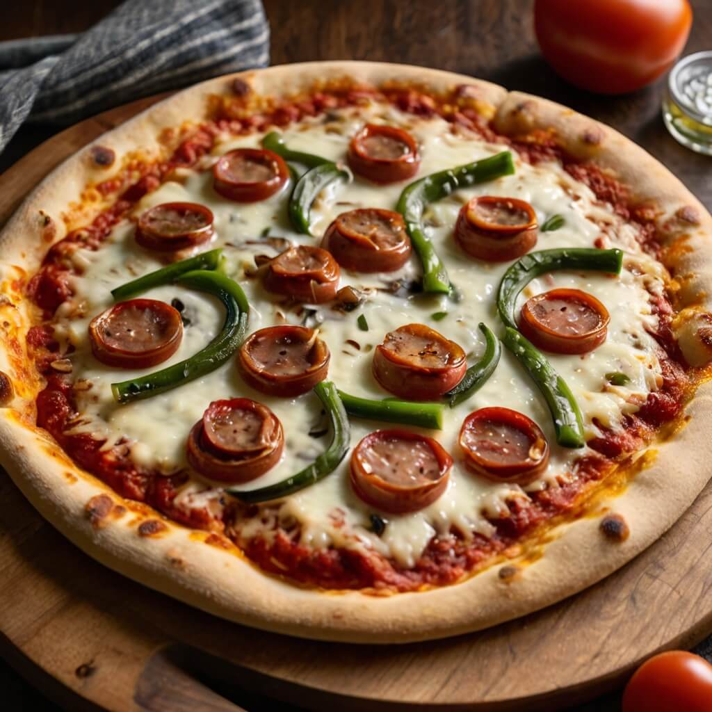 • Pizza: Queijo muçarela, presunto picado, tomate em rodelas e orégano.